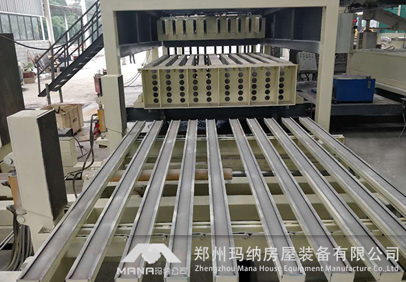 M30石膏墻板生產(chǎn)線主要由①三代不漏漿成組立模②液壓集體分離抽芯機(jī)③自動配料攪拌系統(tǒng)④自動布料機(jī)⑤推板、清模、涂油機(jī)⑥翻板、打包機(jī)⑦計(jì)算機(jī)控制系統(tǒng)⑧上壓成型機(jī)⑨自動圍擋刮面機(jī)等重要部分。