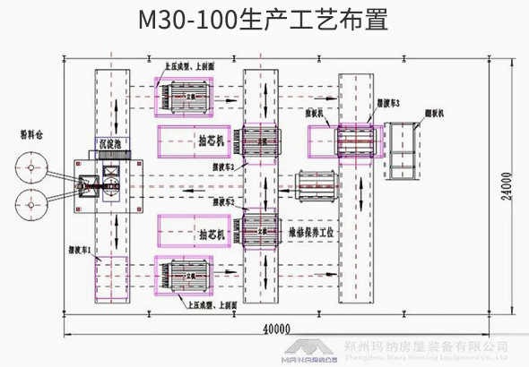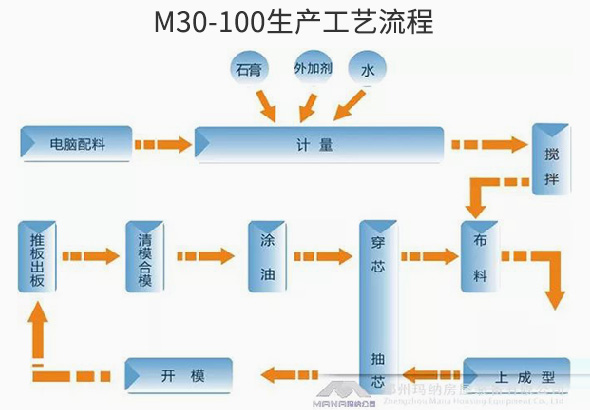 M30石膏墻板生產(chǎn)線主要由瑪納第三代立模成型主機、大抽拔力抽芯機、出板接板合板翻板機構(gòu)、上壓成型機、自動圍擋刮面機、攪拌系統(tǒng)等重要部分組成,其中很多單體設(shè)備都是鄭州瑪納的MN技術(shù)產(chǎn)品,受到國家知識產(chǎn)權(quán)的保護。