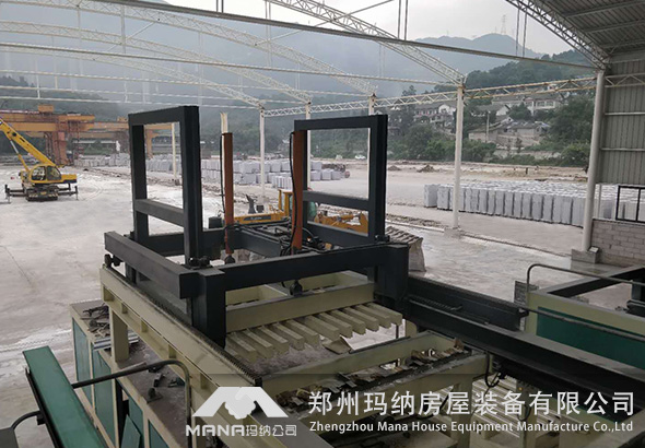 開模完成后,由推板出板機(jī)把成型墻板推出到合板翻板機(jī),6塊為一組合攏在一起,打包。由叉車運(yùn)出成品堆場(chǎng)。