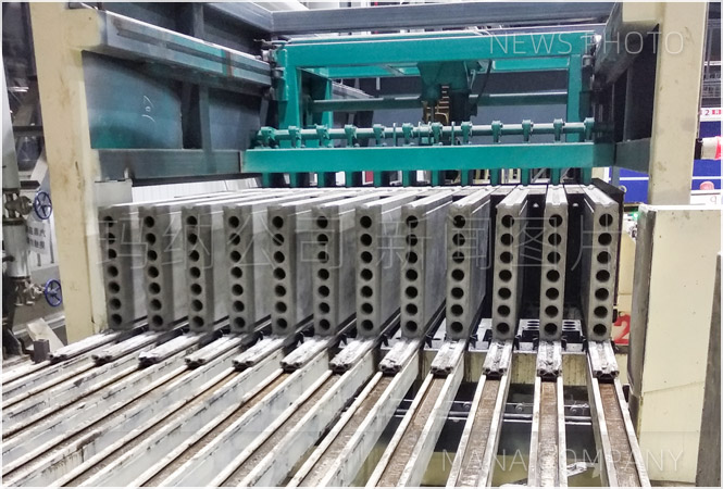 該線采用立模法機組流水工藝,實現(xiàn)模具自動開合,機械上面成型,自動抽芯穿芯,自動出板等工藝技術(shù)。單線產(chǎn)能:100萬m²/年,單線單班用工:人工14 -16人/班。