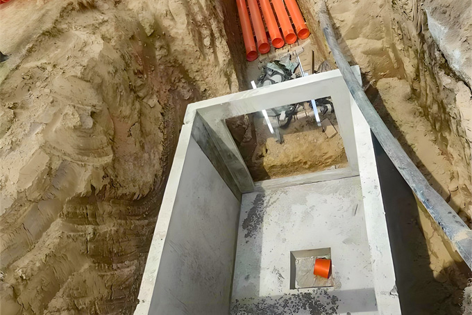 工藝流程:井預(yù)制 - 放樣 - 基坑開挖 - 墊層施工 - 運輸 - 吊裝 - 防水處理