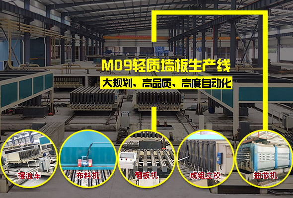 M09墻板生產(chǎn)線利用冶金廢渣生產(chǎn)空心墻板,將工業(yè)生產(chǎn)固體廢棄物轉(zhuǎn)變成綠色建材,其設(shè)備組成如下: