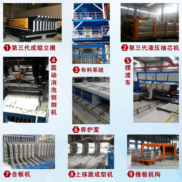 菱鎂輕質(zhì)墻板生產(chǎn)線主要設(shè)備由第三代成組立模、第三代液壓抽芯機、布料系統(tǒng)、上抹面成型機、推板機構(gòu)、合板翻板機構(gòu)、集約式低能耗養(yǎng)護室、擺渡車等重要部分組成,其中配套設(shè)備客戶可根據(jù)需要自由選配,還有一些土建基礎(chǔ)需要客戶自行準備。