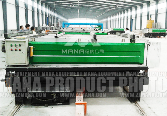 - 5)出板系統(tǒng):等養(yǎng)護(hù)完成后,自動(dòng)行走至出板機(jī)構(gòu)工位,液壓開(kāi)模,再由出板機(jī)把成型板推出,以供打包。